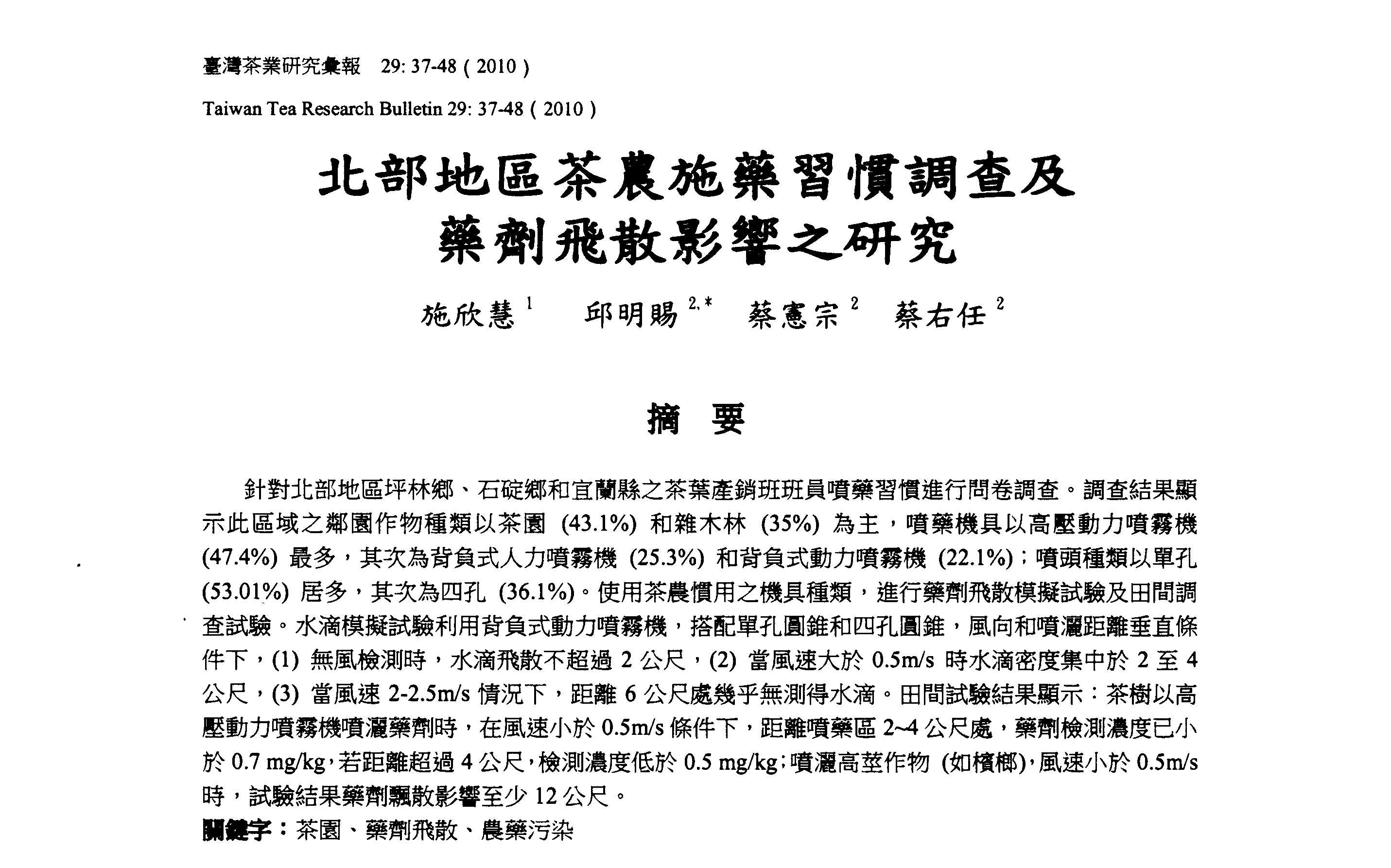 圖為刊載於臺灣茶業研究彙報29卷,由施欣慧、邱明賜、蔡憲宗與蔡右任共同發表之「北部地區茶農施藥習慣調查及藥劑飛散影響之研究」研究論文。