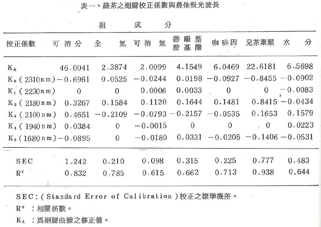 茶業改良場為改善以往茶葉化學分析需耗用大量有機溶劑、設備將龐大樣品針對各成分進行費時費力的分析,自民國73年(1984年)01月至73年(1984年)12月第一次引進近紅外線反射光儀,簡稱為NIRS,雖已應用穀類、飼料成分、豆類分級,但仍須探討分析於茶葉化學成分和茶葉品質鑑定輔助工具之可行性,其試驗比較分析概為試驗機型為Dickey-John Instalab 800型,分六種波長(2310、2230、2180、2100、1940、1680),用在104個樣品上(綠茶26品系 × 4季節),60份為校正組,44份為預測組,針對可溶分、全氮、可溶氮、游離胺基酸、咖啡因、總兒茶素、水分各別比較。結果顯示標準機差較小的全氮、兒茶素類、可溶分分析較好,較大的水分游離胺基酸、可溶氮較不理想,現階段使用NIRS屬快速、簡便和經濟的方式,惟校正標準機差還太大,相關係數低,未來尚需探討以求較佳之校正係數。