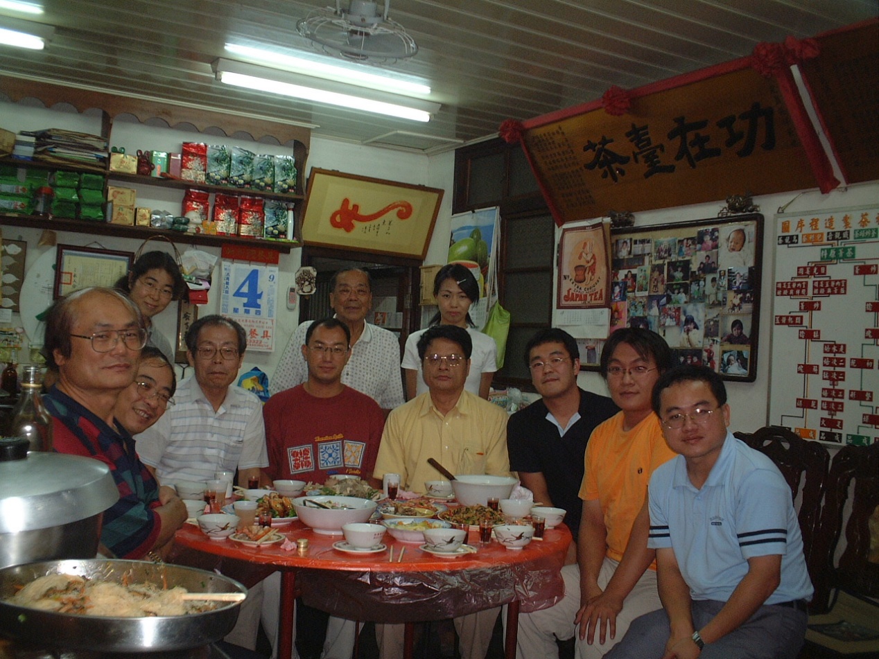 本照片為2004年(民國93年)日本京都大學坂田完三教授一行人造訪茶業改良場商談試驗合作事宜,晚上在徐英祥研究員家中進行宴客時拍攝之照片。照片人物由右至左為蔡憲宗助理研究員、陳俊良助理研究員、清水助教授、林木連場長、水谷准教授、坂田教授、陳玄秘書、陳國任課長。後排為曾參加日本電視冠軍節目茶葉篇的木下朋美小姐、徐英祥研究員及研究生鈴木小姐。